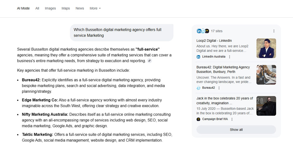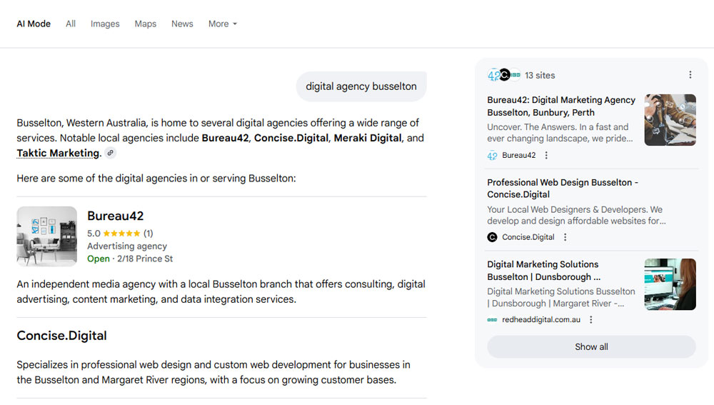 - Local search impact: Australian businesses that invest in local SEO and accurate Google Business Profiles will have a stronger chance of being referenced by AI-generated overviews.